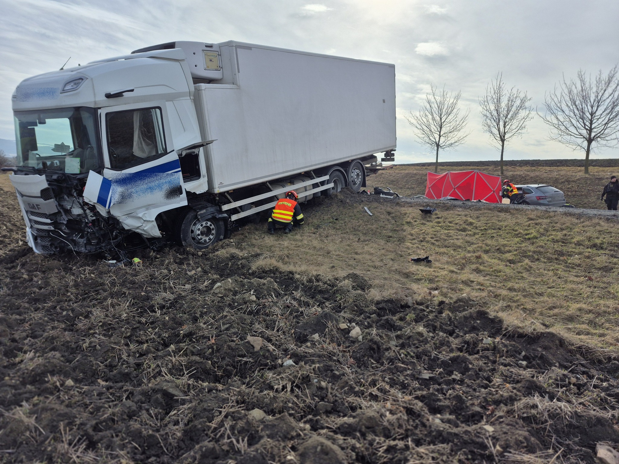 Řidič osobního automobilu přejel do protisměru pod nákladní automobil, následky nehody jsou tragické.