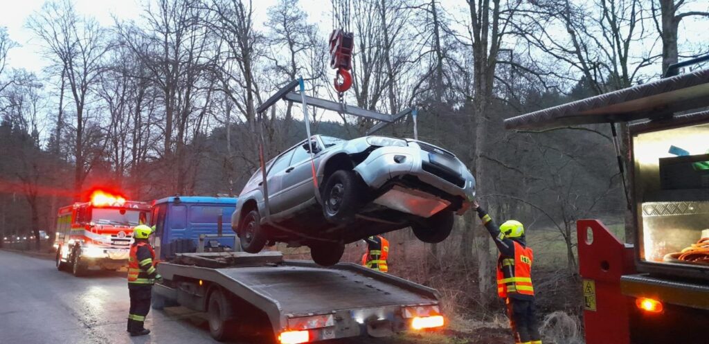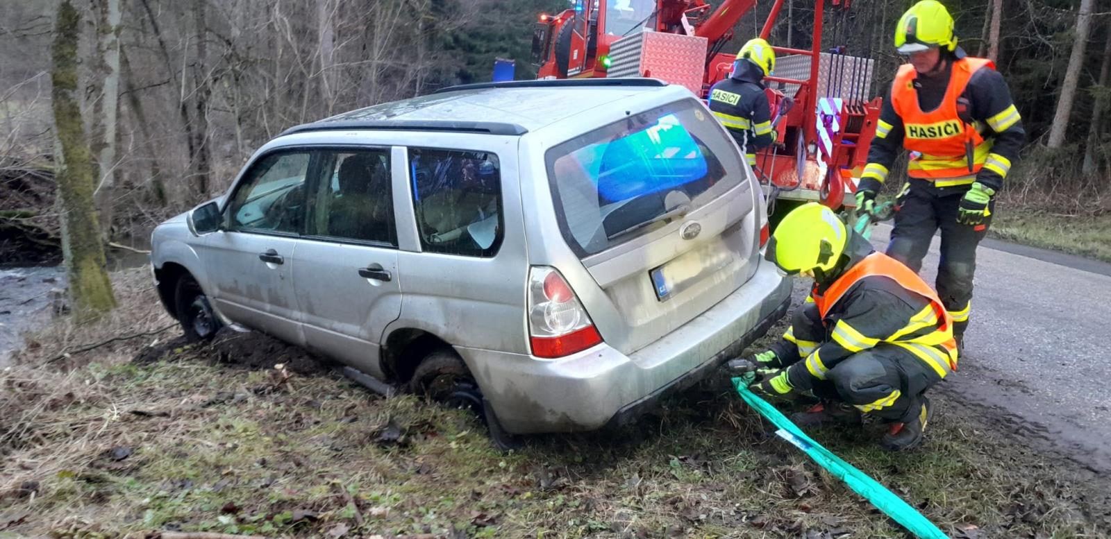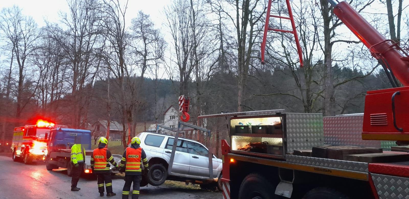 Auto z potoka vytahovali hasiči ze Semil s vyprošťovacím automobilem