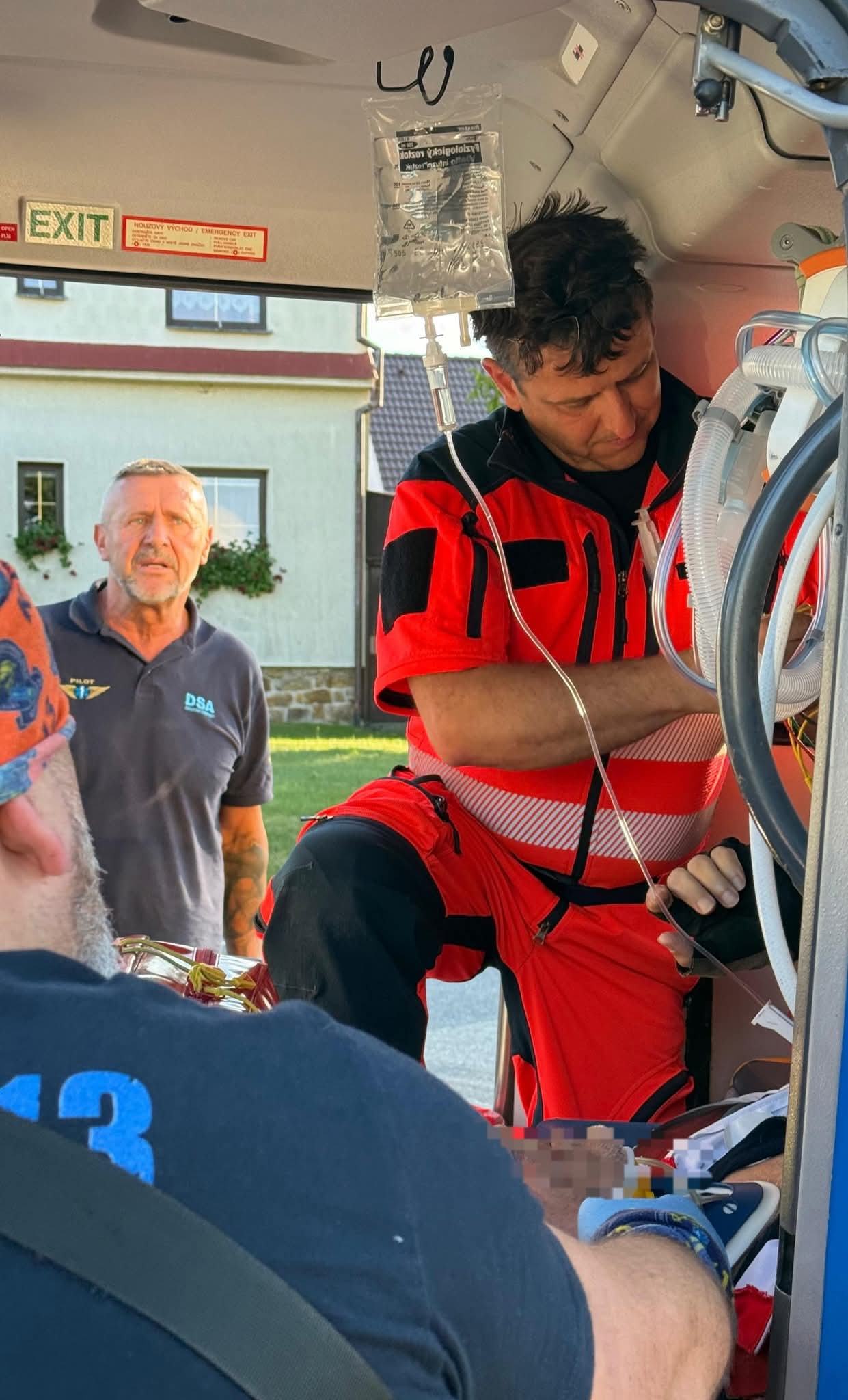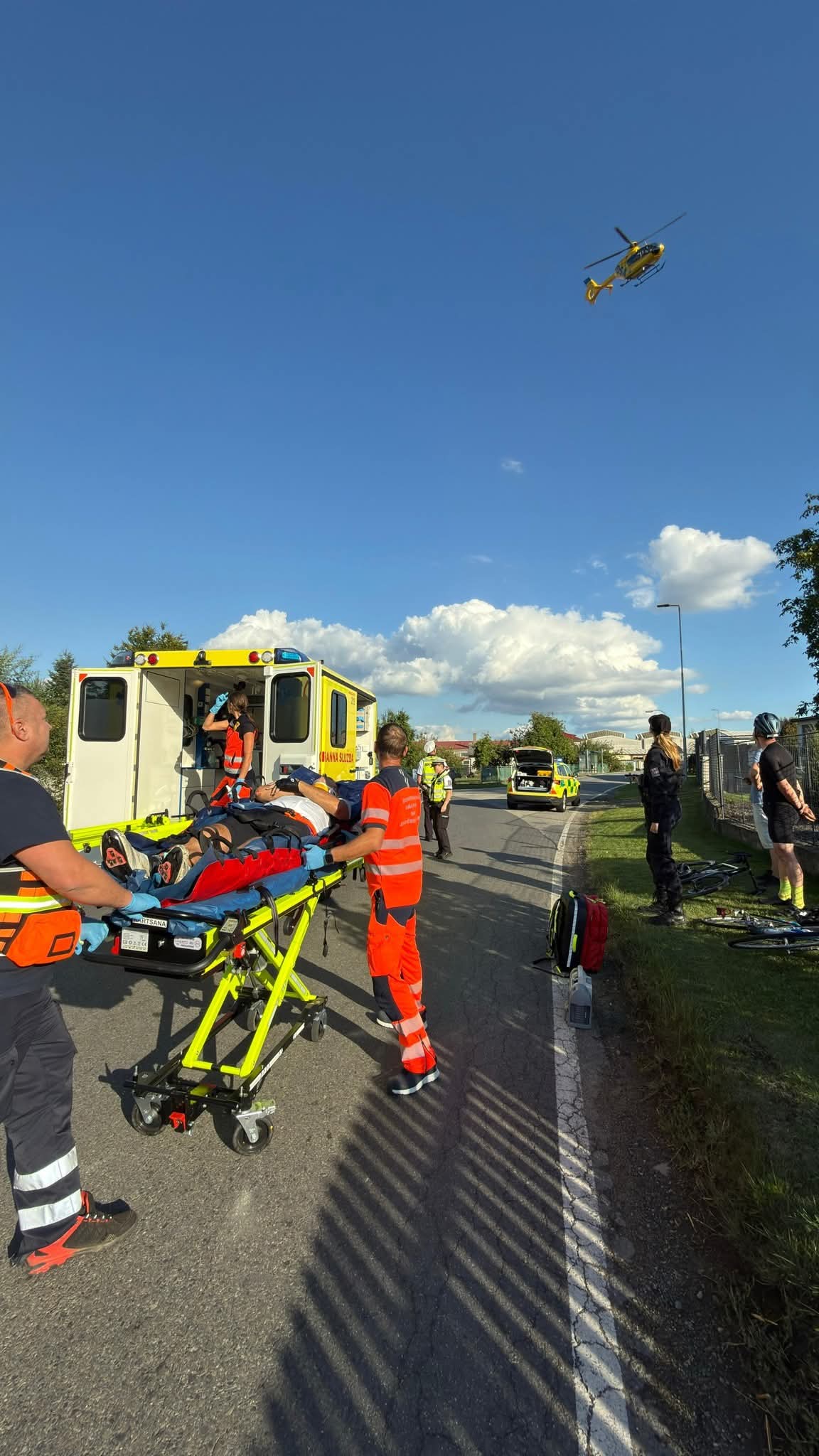 🚴♂️ Utrpěl poranění hlavy a lékař vyslovil podezření na poranění pánve. Na místě jsme mu zajistili žilní vstup, podali léky na bolest, přiložili krční límec a pánevní pás.