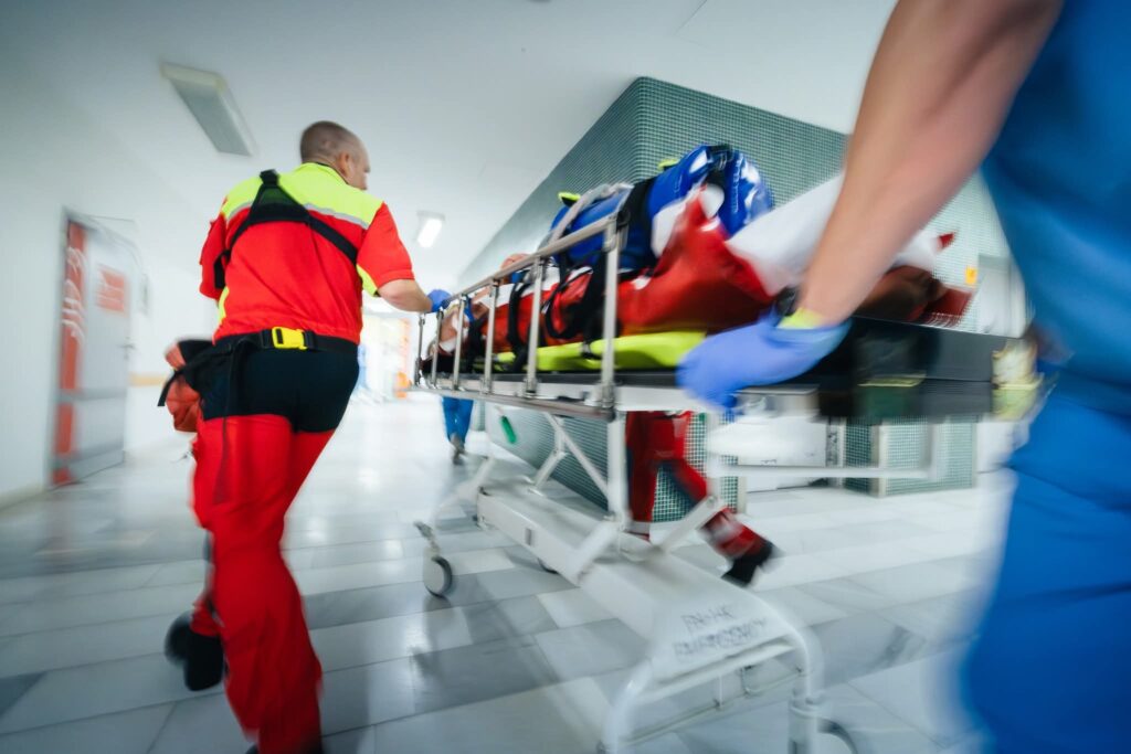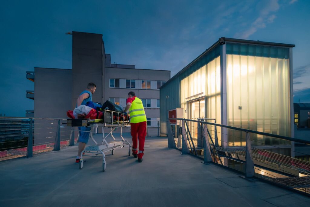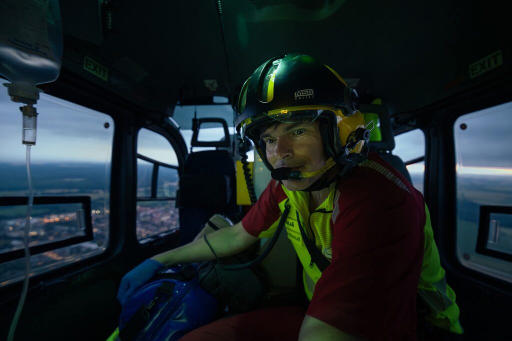 Lékař po celou dobu transportu tlačí prsty na cévy pacienta, aby nevykrvácel. Díky operačnímu středisku jsou ve Fakultní nemocnice Hradec Králové připravení a tým letecké záchranné služby předává zraněného přímo na operačním sále.