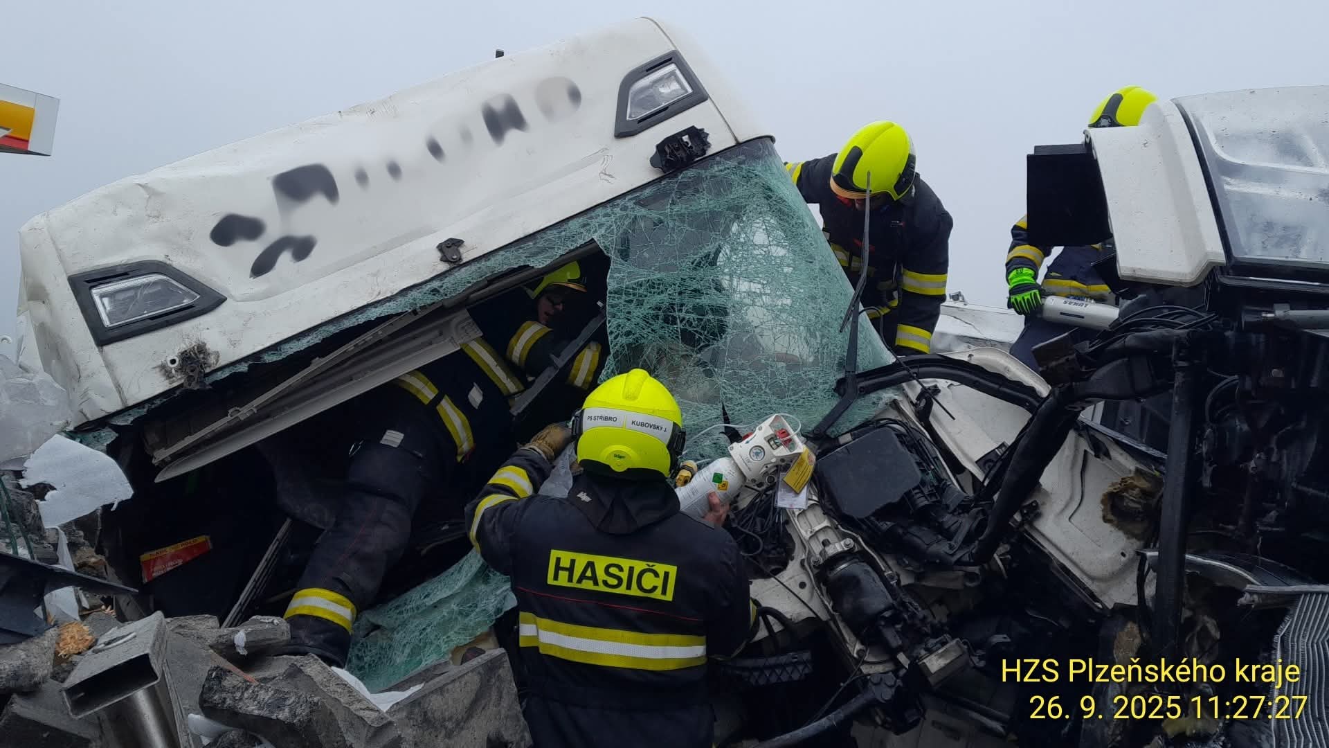 Na 123 km D5 směr Rozvadov zasahujeme u nehody dvou kamionů v prostoru čerpací stanice. Jednu osobu vyprošťujeme. Na místě přistává vrtulník LZS. Po nehodě došlo k menšímu pořáru, který uhasila obsluha přenosným hasicím přístrojem. Dálnice v místě uzavřena, uvedl tiskový mluvčí HZS Plzeňského kraje Petr Poncar.
