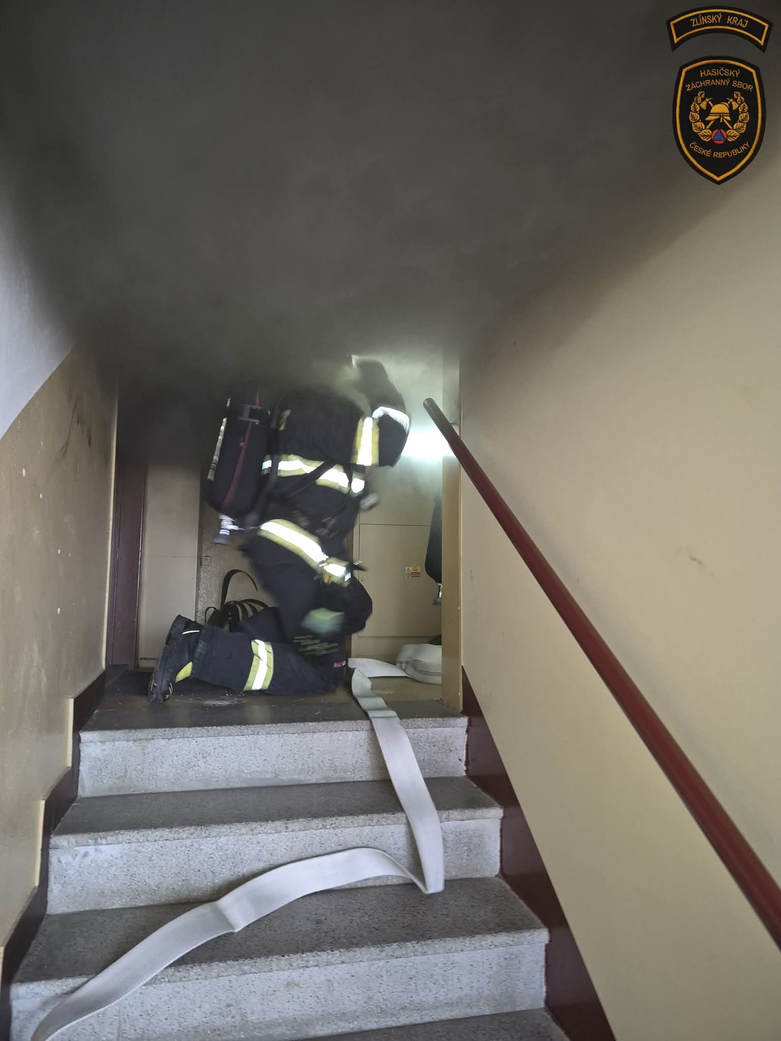 Na místo události bylo vysláno celkem šest jednotek hasičů a vyhlášen byl druhý stupeň požárního poplachu. Už při příjezdu se z oken nejvyššího patra valil hustý černý kouř, který signalizoval, že situace uvnitř je vážná. Hasiči okamžitě provedli rychlý průzkum, po schodišti natáhli hasební vedení až k zasaženému bytu a zahájili intenzivní hasební práce.