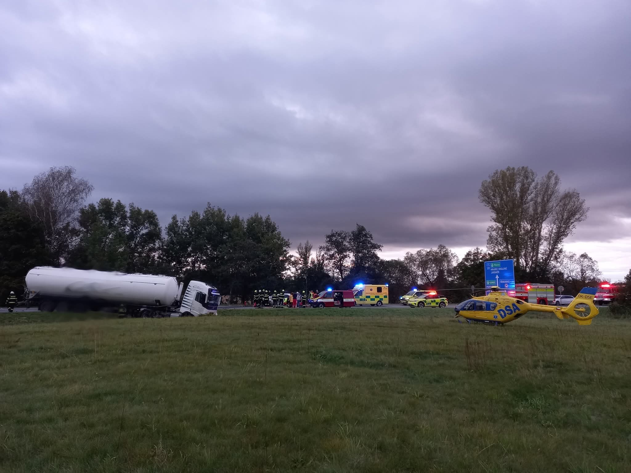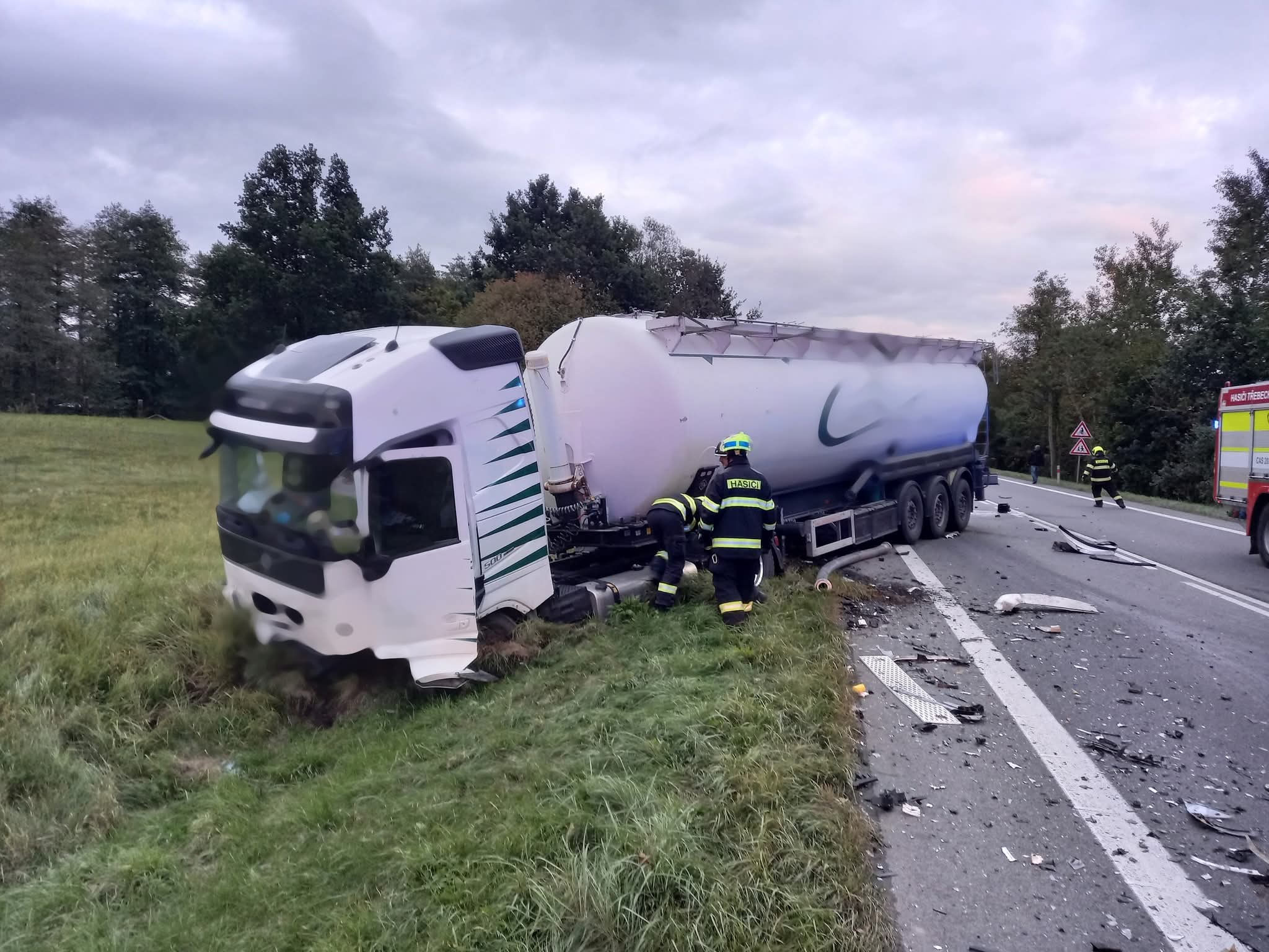 Druhá vážná nehoda uzavřela před 18. hodinou silniční tah na Týniště nad Orlicí I/11. Po nárazu zůstalo osobní vozidlo na komunikaci, nákladní automobil (cisterna) vyjel částečně mimo do příkopu. Na místo byli vysláni profesionální hasiči z centrální stanice Hradec Králové a JSDH Třebechovice pod Orebem. Zabezpečovali místo události a kontrolovali, zda nedochází k úniku látek z cisterny. Zraněný muž z osobního vozidla byl přepraven do nemocnice vrtulníkem LZS, později však podle informací PČR zemřel. Hasiči zůstávali na místě i po vyproštění obou havarovaných vozidel, zasypali a zlikvidovali vyteklý olej v příkopu a vyrozuměli o úniku orgány ochrany životního prostředí. Komunikace byla na nezbytně nutnou dobu uzavřena, provoz byl obnoven v pozdějších večerních hodinách.