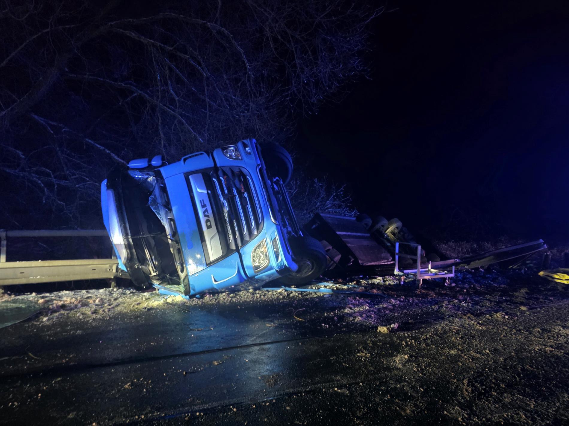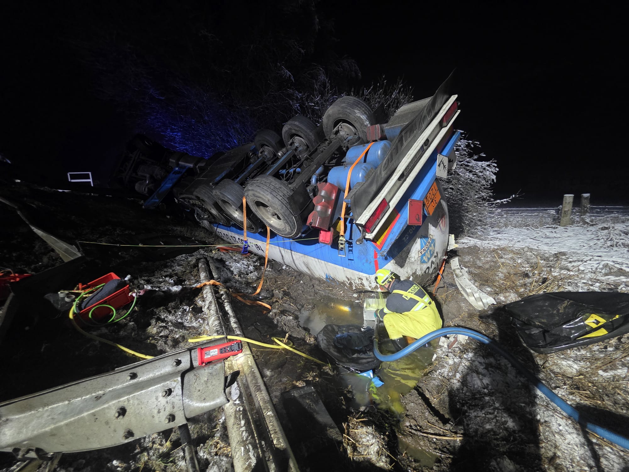 Na Rakovnicku u Žďáru za obcí Jesenice společně s hasiči Středočeského kraje řešíme havárii cisterny s únikem asi 8 tisíc litrů pohonných hmot. Silnice je obousměrně uzavřená a objízdné trasy jsou označené. Přečerpání a vyproštění kamionu bude náročné, odhadujeme to na zhruba 24 hodin, uvádí policie na síti X.