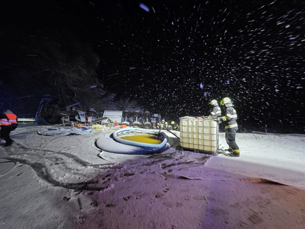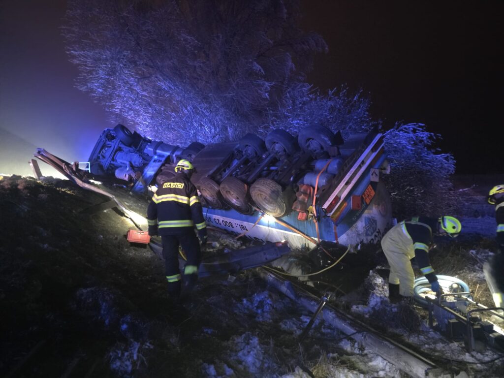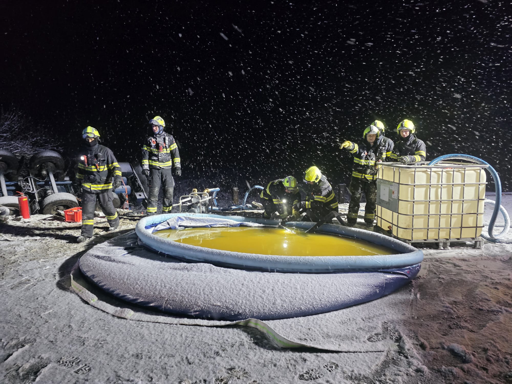 Od nočních hodin zasahujeme nedaleko obce Žďár na Rakovnicku, kde došlo k převržení pětikomorové cisterny převážející naftu a benzín. Řidiče jsme z vozidla vyprostili a předali jsme ho do péče zdravotnické záchranné služby. Na místě docházelo k masivnímu úniku převáženého materiálu do půdy a do blízkého potoka. Z tohoto důvodu nasadili hasiči několik sorpčních hadů, použili velké množství sorbentu a dalších sorpčních prostředků. Přizvali jsme k součinnosti pracovníka životního prostředí a vodoprávního úřadu. Událost je řešena ve druhém stupni požárního poplachu a rozdělena na dva úseky. Jeden na přečerpávání látky z cisterny a druhý na unikající látky. Na místě jsme zachytávali unikající kapaliny do speciální nádoby, z které jej přečerpáváme do dovezených IBC kontejnerů. Z cisterny je nejprve nutné přečerpat zbývající naftu a benzín, protože při manipulaci by mohlo dojít k roztržení armatur a tím další kontaminaci okolí. Poté bude teprve možné cisternu vyprostit. Silnice je obousměrně uzavřena pro veškerou dopravu. Na místě zasahuje osm jednotek, tři profesionální a pět dobrovolných.
