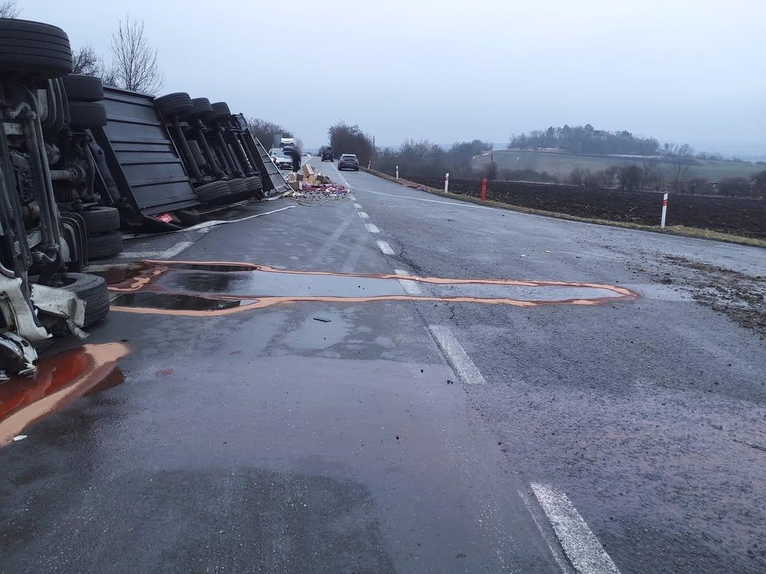 Na silnici I/52 před Mikulovem ve směru od hranic zasahujeme u nehody kamionu převážejícího jablka. Zůstal ležet na boku. Řidiče jsme nemuseli vyprošťovat. Na místě dochází k většímu úniku nafty z nádrží. Chystáme se k přečerpávání. Zasahují zde profesionální jednotky ze 3 stanic. Silnice je částečně průjezdná.