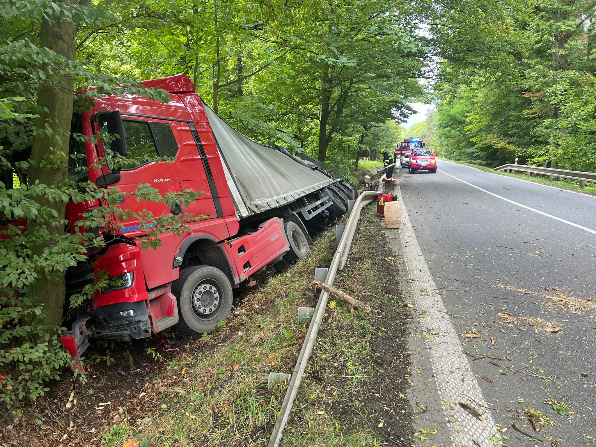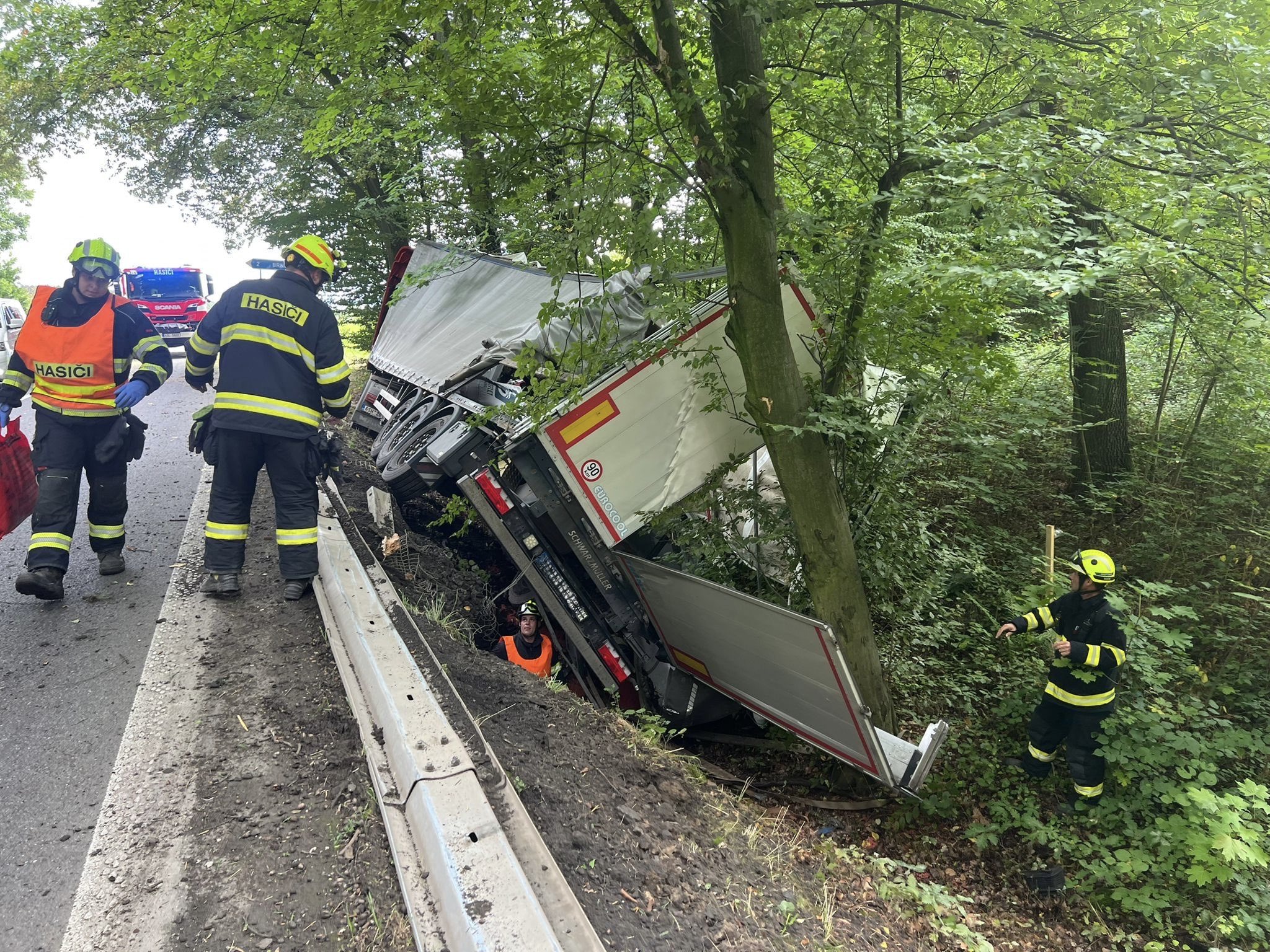 Dopravní nehody nákladního automobilu zasahují 3 jednotky hasičů. Vozidlo převážející pšenici sjelo do příkopu a narazilo do stromu. Jednotky provádí odčerpávání unikající nafty a protipožární opatření. Řidič předán do péče @zzs_sk. 🚑 Provoz v místě nehody je řízen kyvadlově.