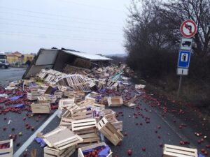 Na silnici I/52 před Mikulovem ve směru od hranic zasahujeme u nehody kamionu převážejícího jablka.[...]