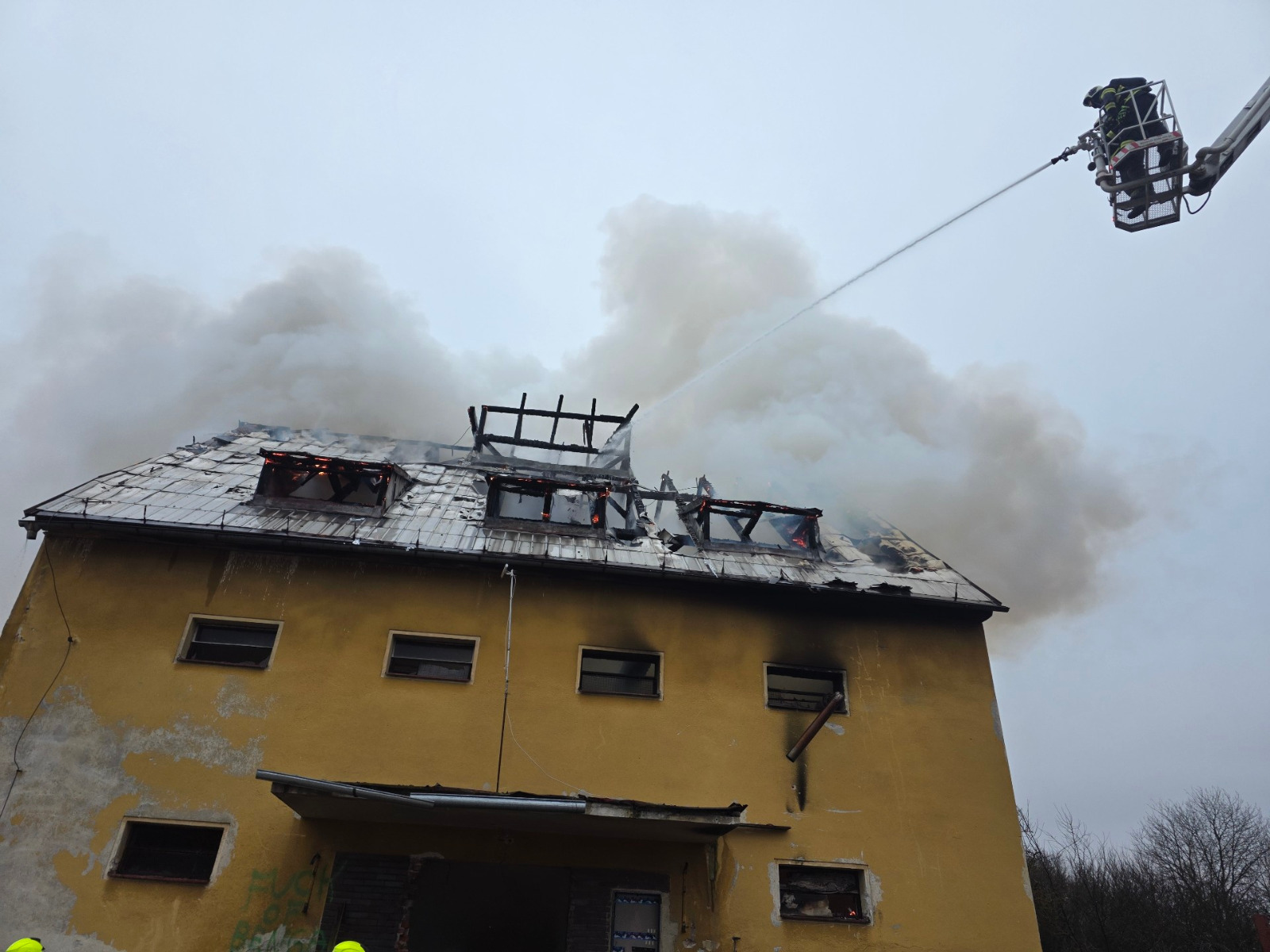 Momentálně hasiči pomocí výškové techniky rozebírají střechu a pátrají po skrytých ohniscích. V 15:38 velitel zásahu oznámil, že požár je lokalizován.