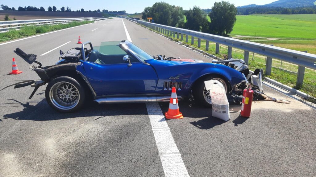 Policisté z dálničního oddělení Borek řeší dopravní nehodu, ke které došlo v sobotu 9. srpna před 13:00 hodinou na dálnici D3 mezi Českými Budějovicemi a Kaplicí. Řidič s vozidlem značky Chevrolet Corvette C3 narazil do pravých svodidel, následně dostal smyk a poté automobil zastavil napříč komunikací. Příčinou nehody byl stanoven špatný technický stav automobilu, který způsobil závadu na motoru a vozidlo se tak stalo neovladatelným. Řidič byl se zraněním převezen do českobudějovické nemocnice. Policisté mu provedli dechovou zkoušku s negativním výsledkem. Předběžná škoda, která vznikla na vozidle a svodidlech, byla vyčíslena na více než 2 500 000 korun, uvedla tisková mluvčí Jihočeské policie Štěpánka Schwarzová.