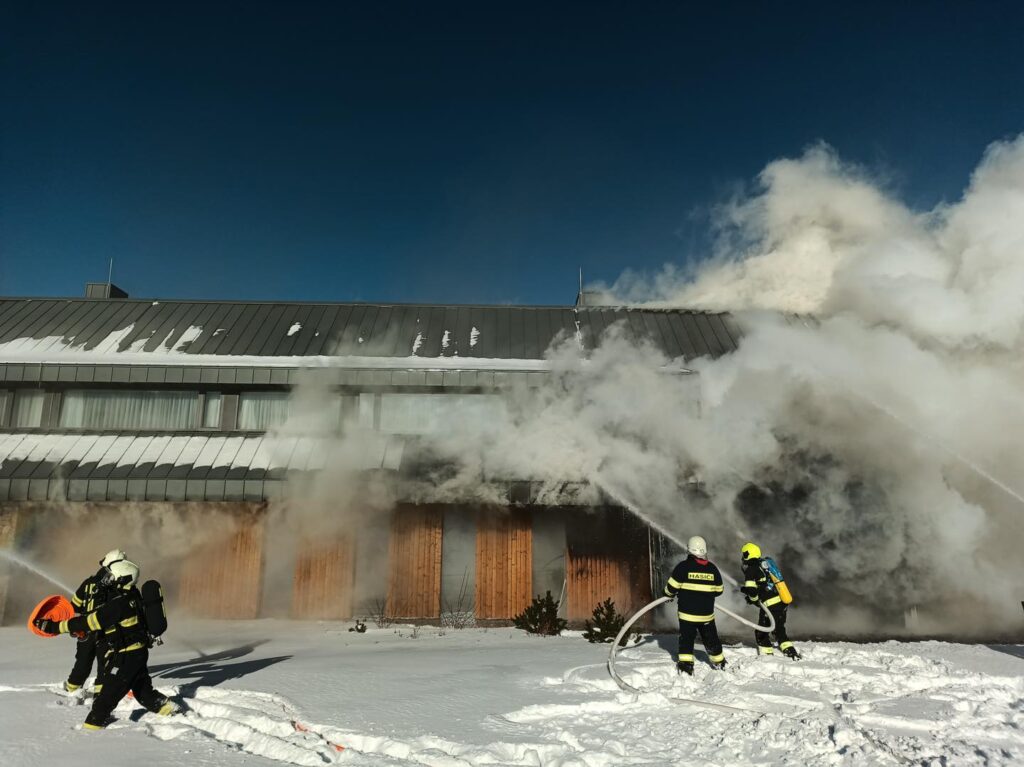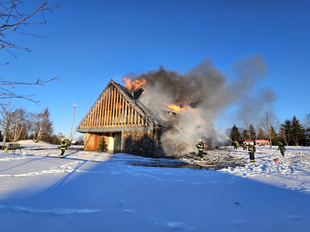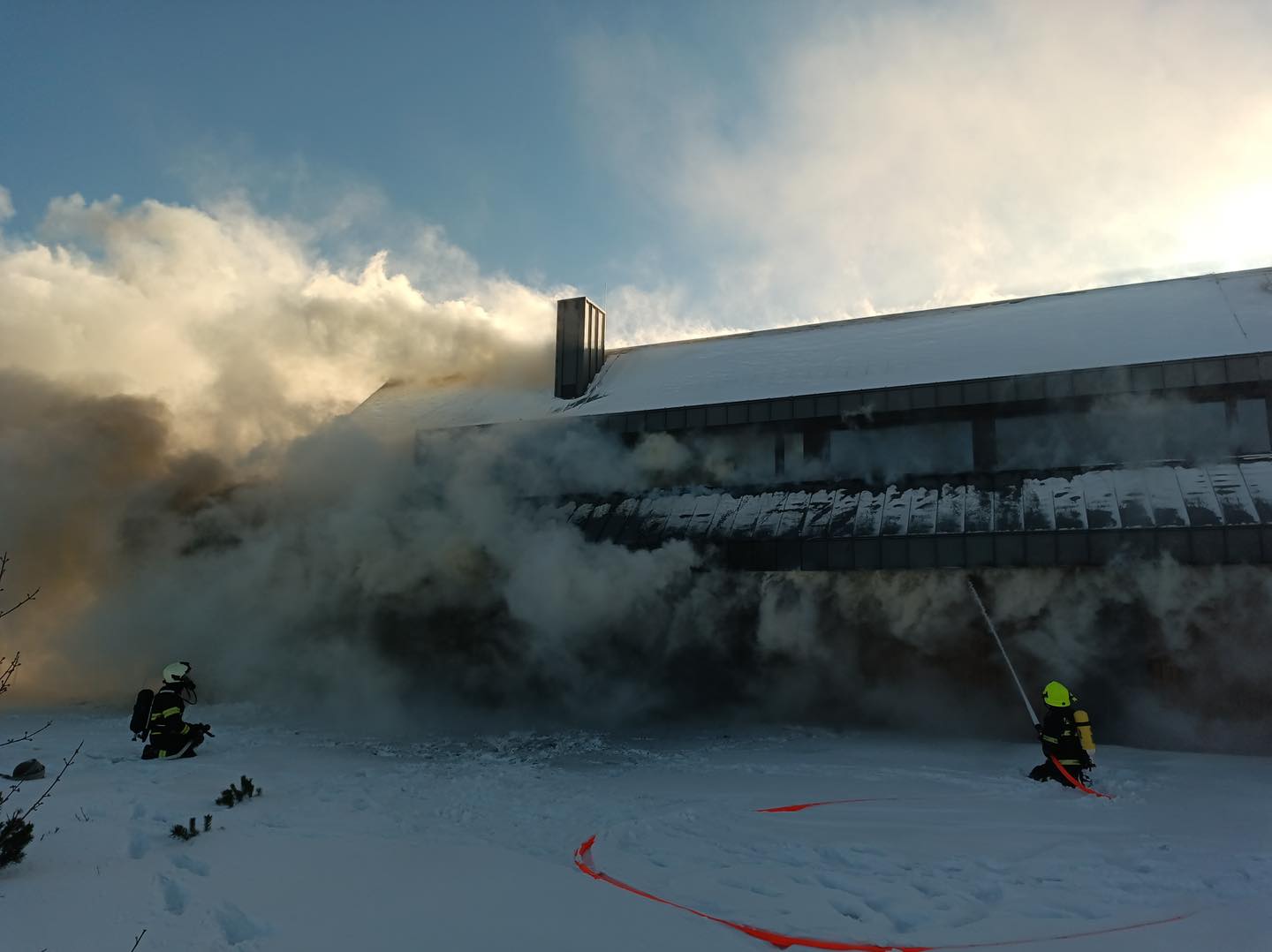 Hasební práce stále pokračují i po 19. hodině, foto a video z 16. h. Teplota klesla na -16C. Hasiči mají na místě týlový kontejner jako zázemí, zasáh komplikuje mráz a vítr.
