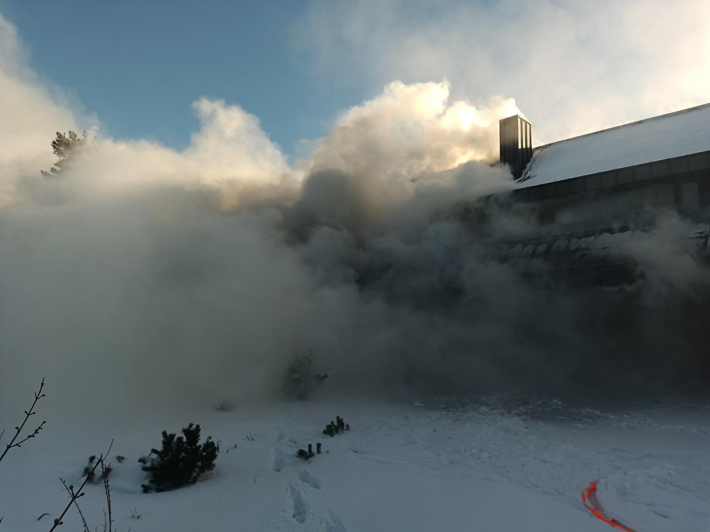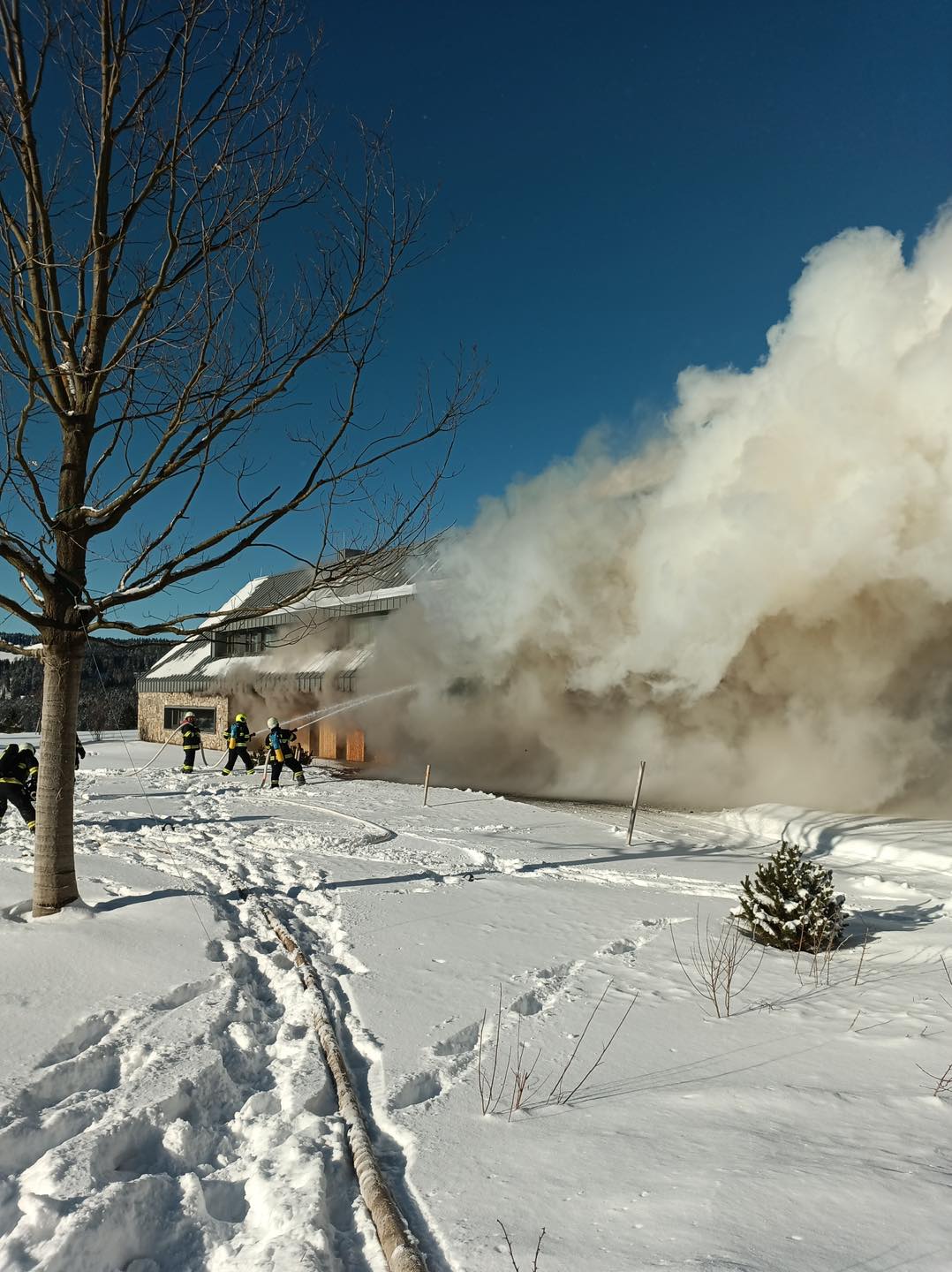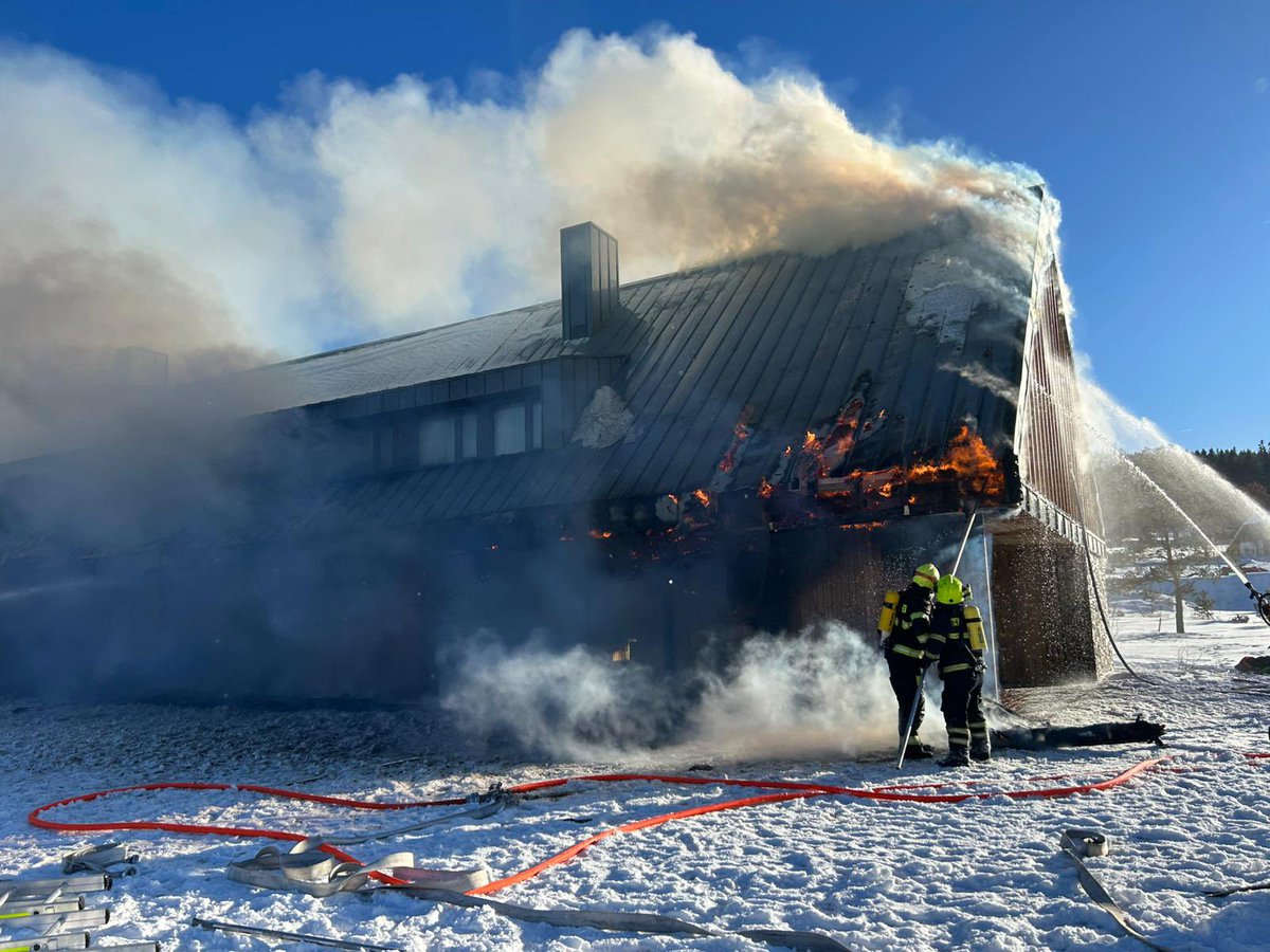 Hasební práce stále pokračují i po 19. hodině, foto a video z 16. h. Teplota klesla na -16C. Hasiči mají na místě týlový kontejner jako zázemí, zasáh komplikuje mráz a vítr.