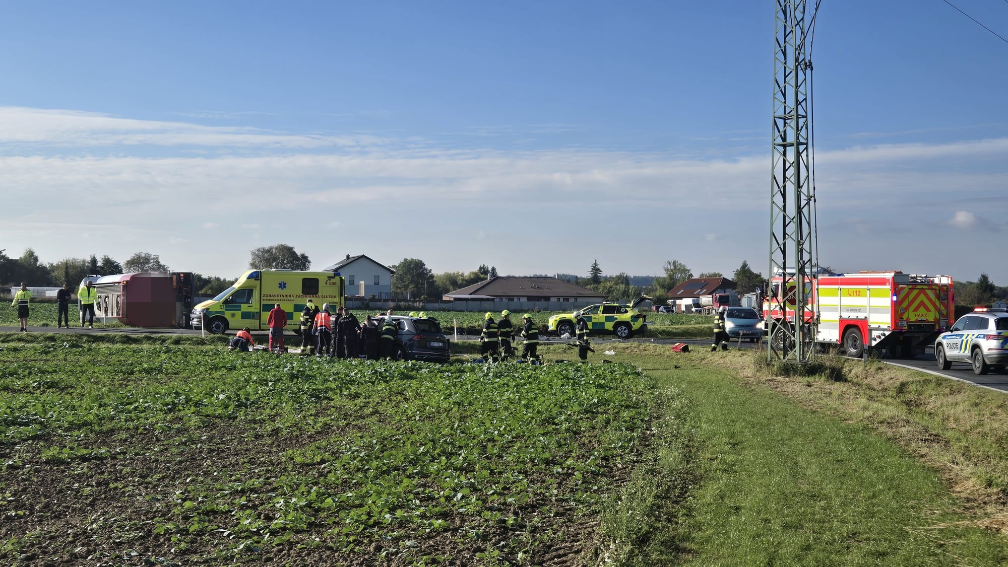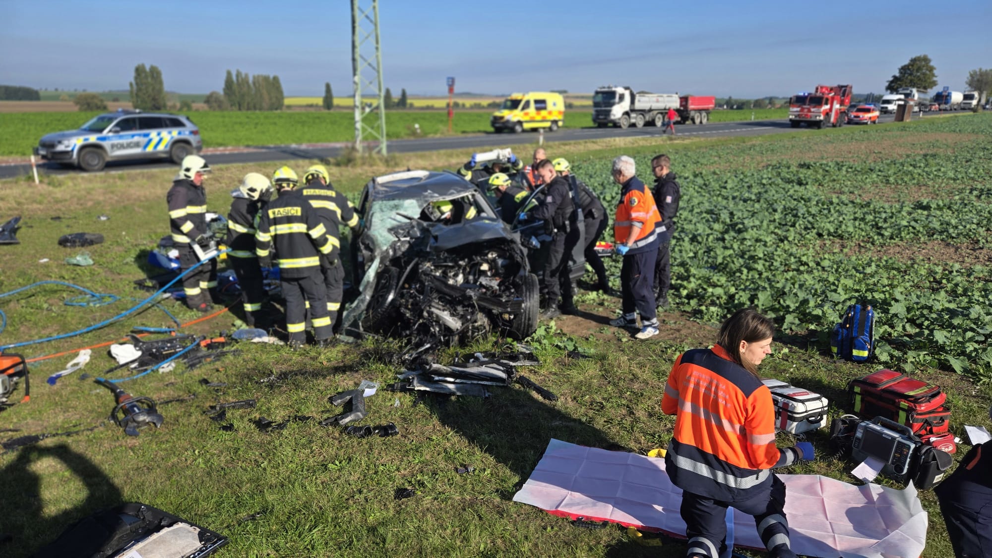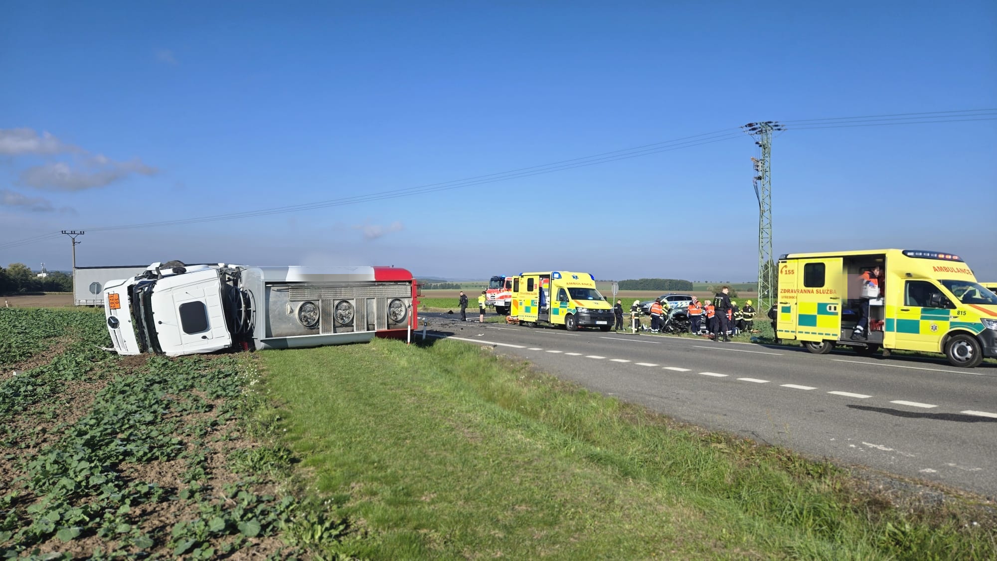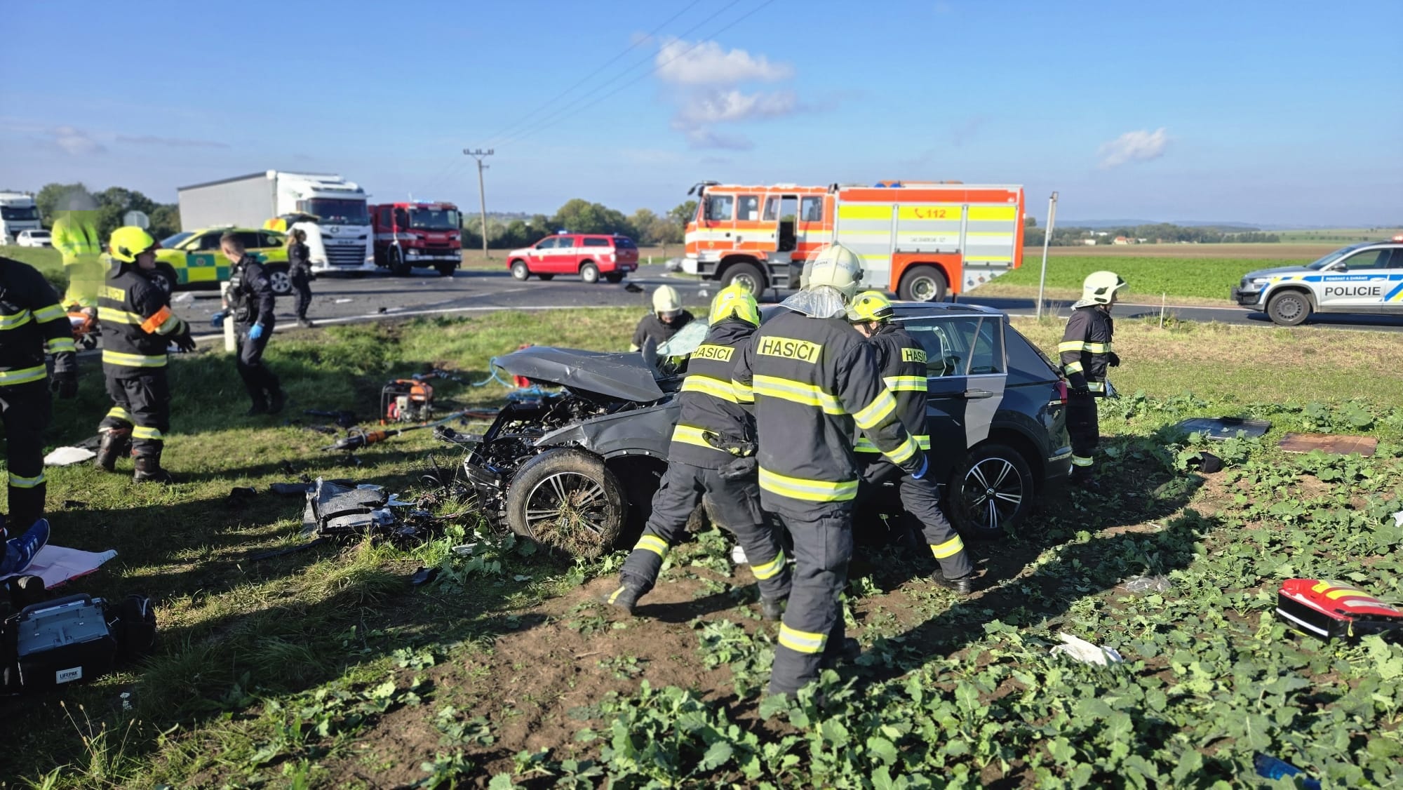 Osobní automobil dopadl hůře a bylo nutné vyprostit dvě osoby, které jsme následně předali do péče @ZZS SCK. U nehody zasahovala i Letecká záchranná služba. Nás nyní nás čeká zabezpečení místa dopravní nehody a úklid po dopravní nehodě.