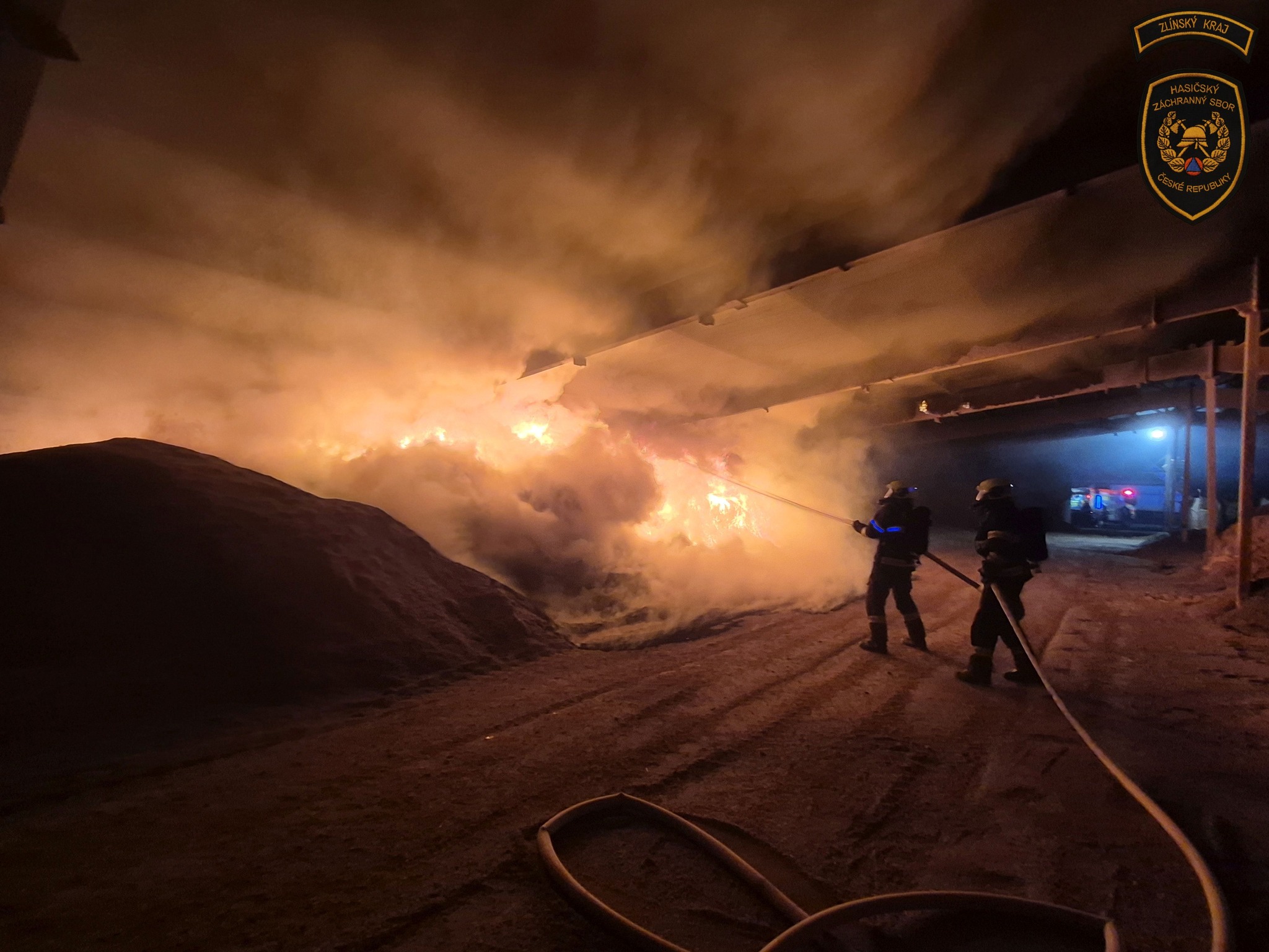 Klidný večer narušily dnes krátce před devátou hodinou večerní plameny šlehající z velké haly v Huštěnovicích na Uherskohradišťsku, kde došlo k požáru biomasy slunečnicových semen. Událost byla na tísňovou linku hasičů oznámena jen několik minut před 21. hodinou.
