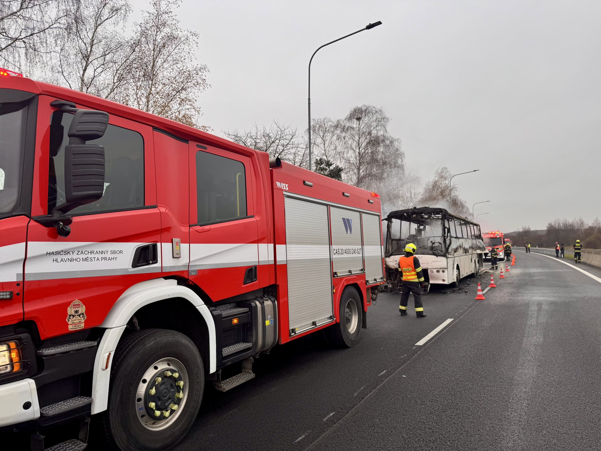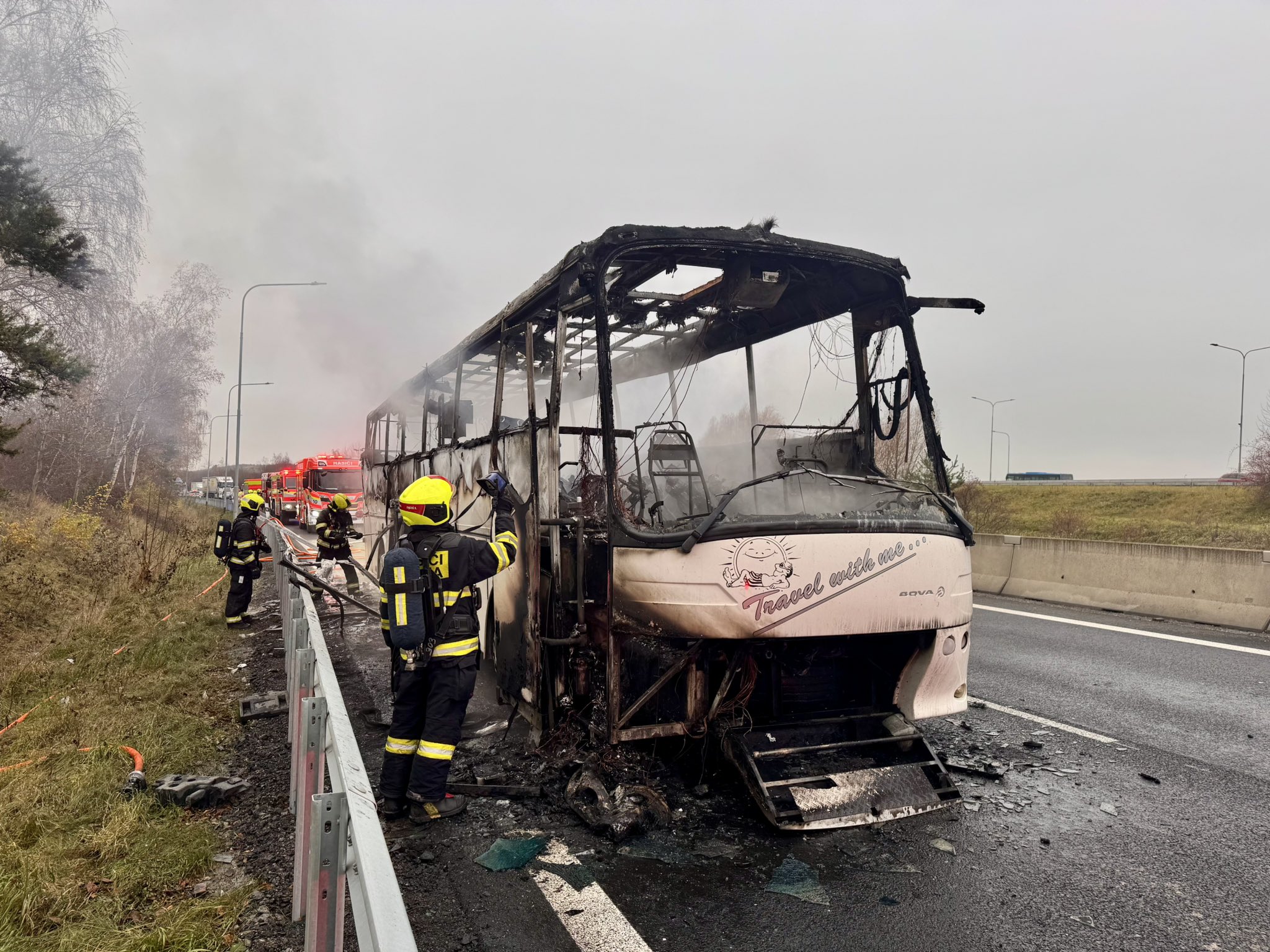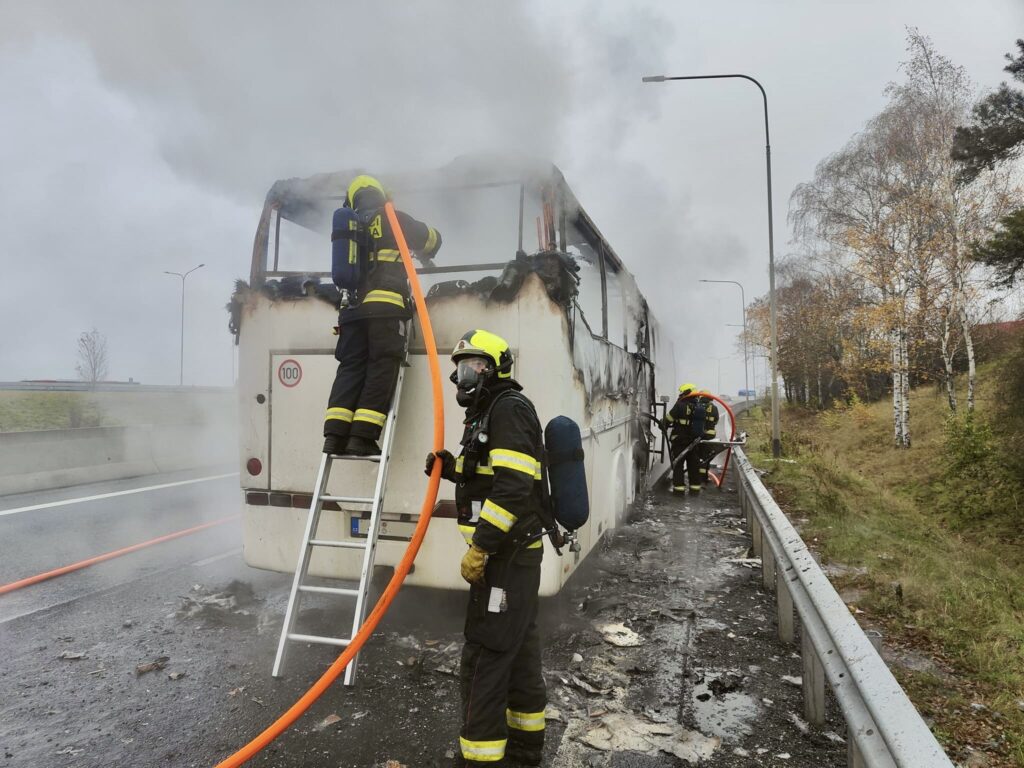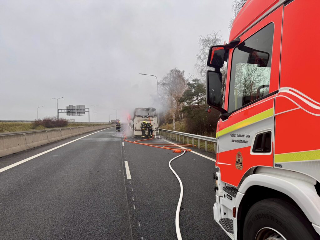 Pět jednotek hasičů zasahovalo u požáru autobusu na úseku D0 a D10. Oheň zachvátil celý autobus, který byl uhašen dvěma vodními proudy. Nyní probíhají dohašovací práce a kontrola termokamerou. V autobusu cestoval pouze řidič, který je v péči záchranářů. Provoz byl obnoven.