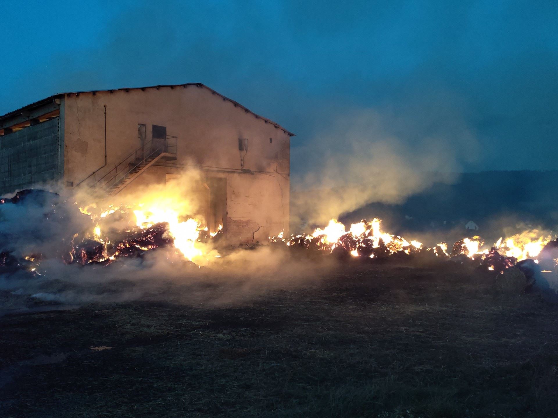 Jednotky vyjely na místo v 18.08 hodin. Po příjezdu na místo byl sklad sena a slámy zcela zasažen plameny, tedy ve třetí fázi požáru. Z důvodu hrozícího zřícení objektu nebylo možné zasahovat uvnitř, hašení tedy bylo prováděno z bezpečné vzdálenosti. Ve spolupráci s technikou majitele byly odváženy dosud nezasažené balíky do bezpečí. Zasažený uskladněný materiál kontrolovaně přes noc, ale i během pondělního dopoledne dohořel. Zařízeno bylo i pravidelné střídání zasahujících hasičů, pitný režim i strava.