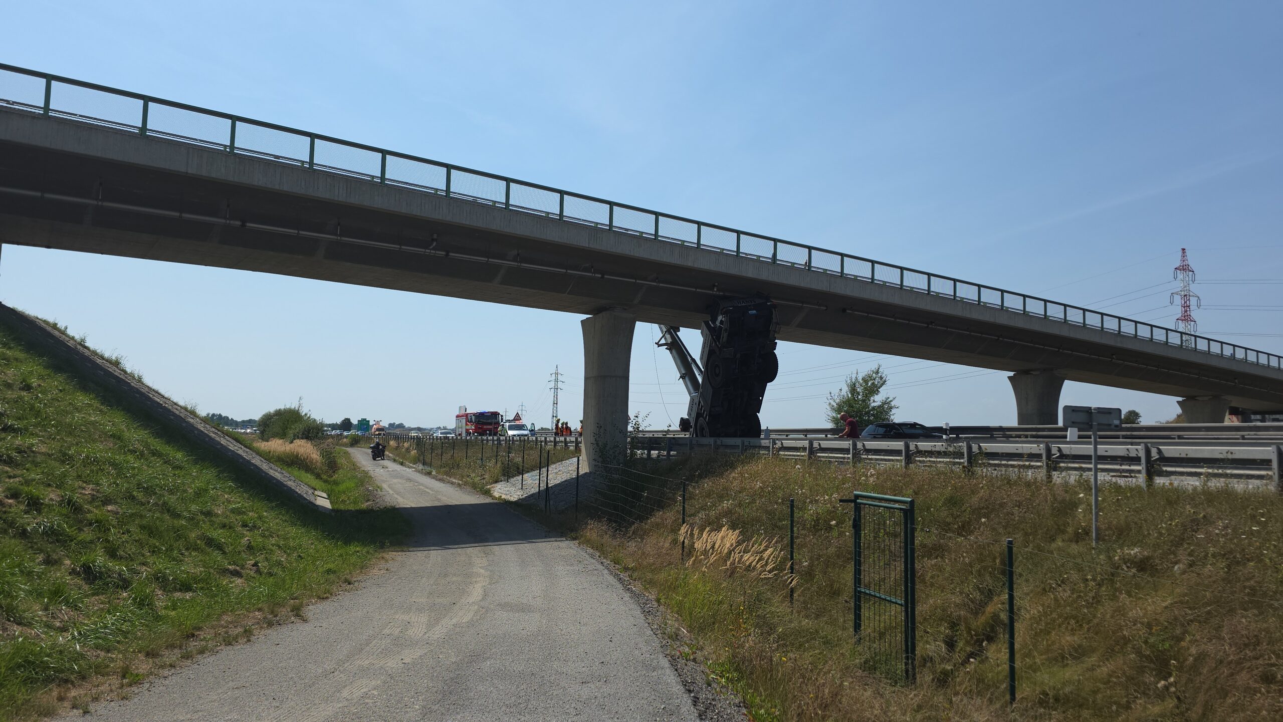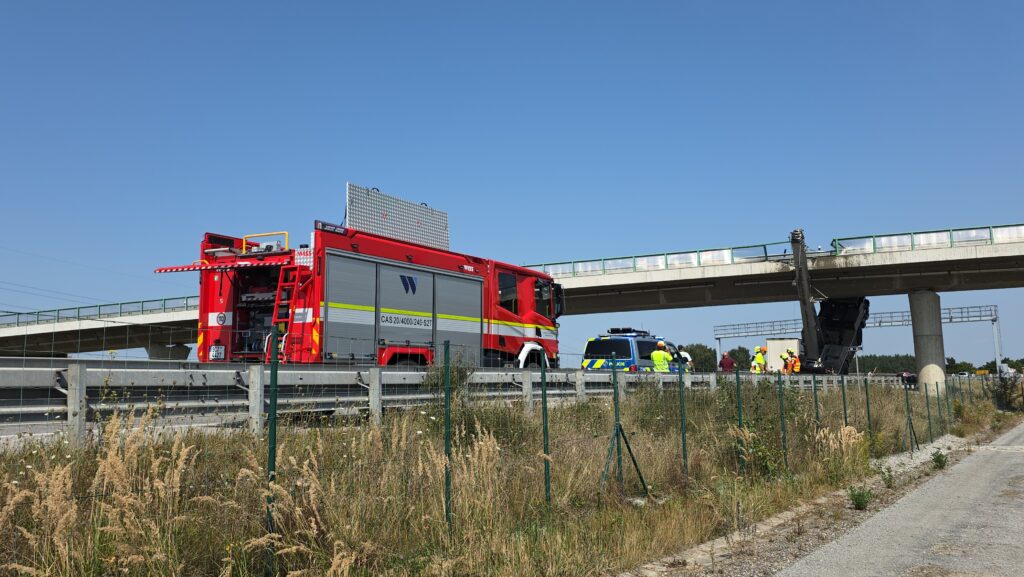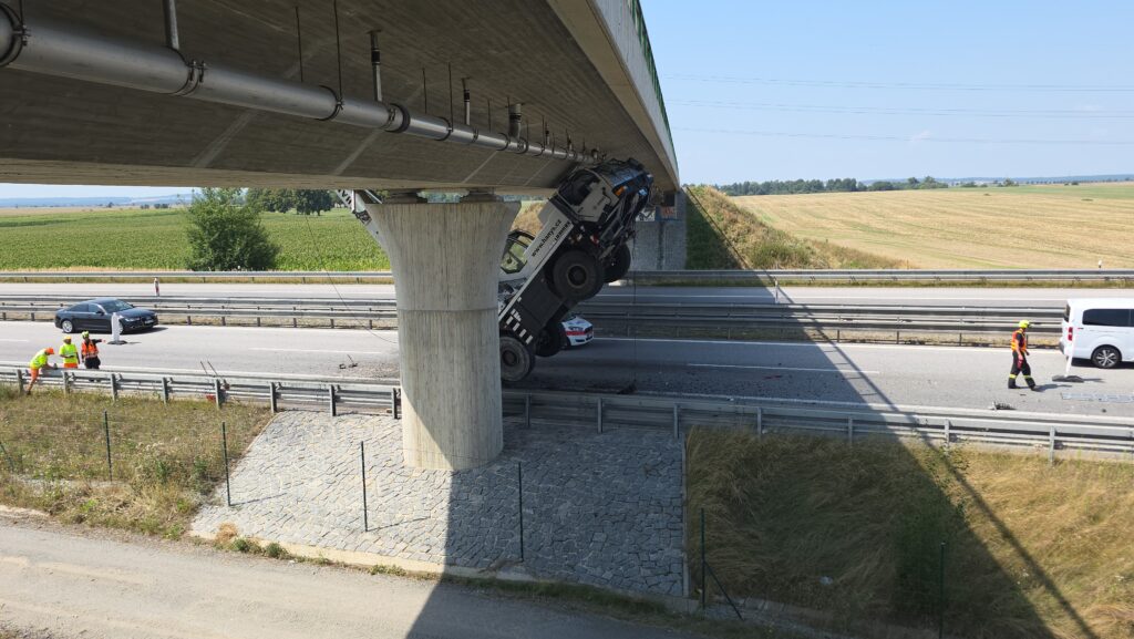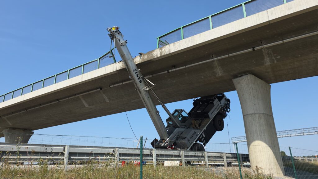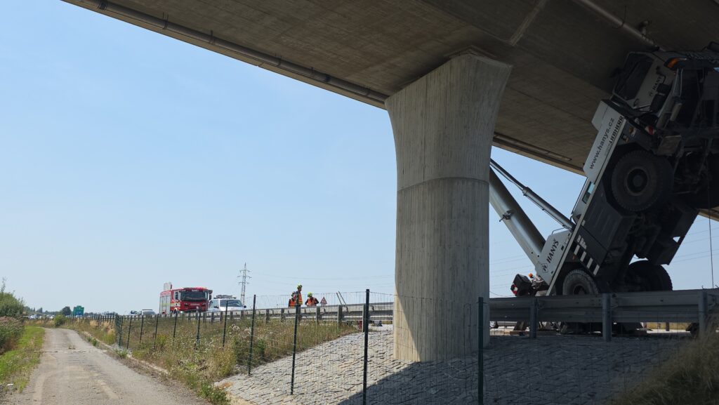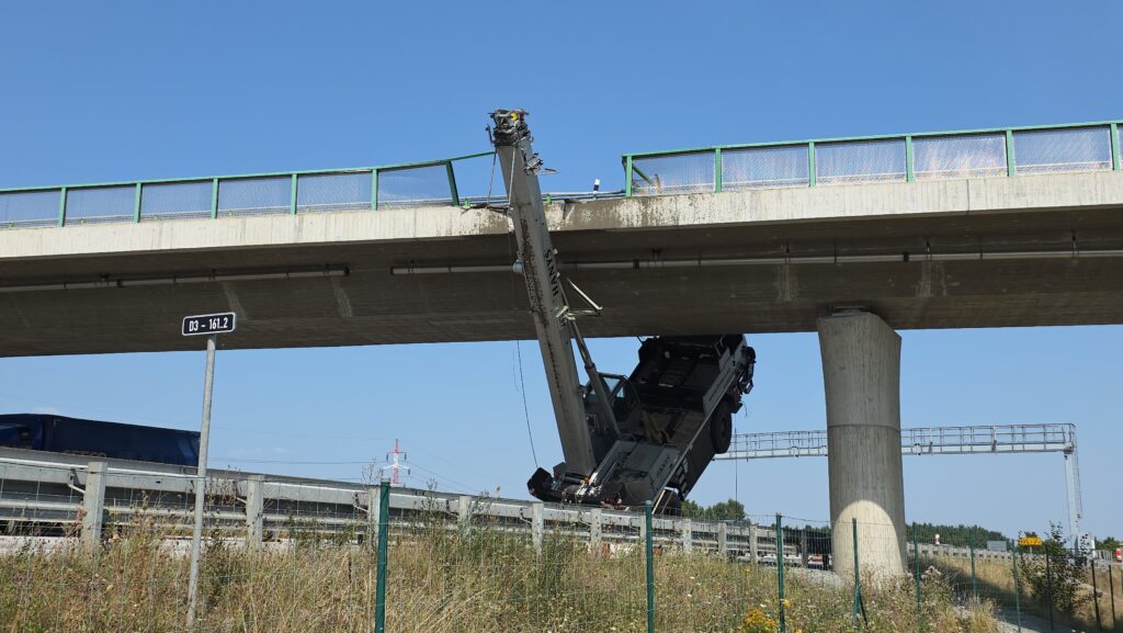Jeřáb ze zvednutým ramenem nepodjel most a zaseknul se do jeho konstrukce. V kabině zůstal řidič, kterého byli hasiči připraveni vyprošťovat. Řidič ale neměl žádná viditelná zranění a z kabiny dolů na zem slezl za asistence hasičů sám po nastavovacím žebříku,“ přiblížili hasiči.