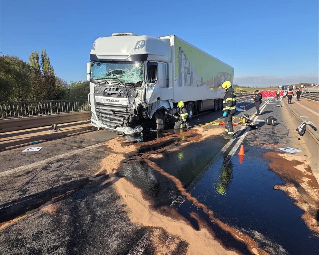 U tragické dopravní nehody dnes dopoledne zasahovali profesionální hasiči z Kladna a Slaného, řídící důstojník a dobrovolní hasiči ze Zlonic. Na silnici I/7 došlo ke střetu nákladního a dodávkového automobilu. Jedna osoba střet nepřežila, další museli z vozu vyprostit hasiči. Následně musely jednotky řešit masivní únik provozních kapalin z nákladního automobilu. Uniklé látky zasypaly sorbentem ve spolupráci se Správou a údržbou silnic, ty z poničených nádrží musely přečerpat. Silnice byla zavřena několik hodin pro veškerou dopravu.