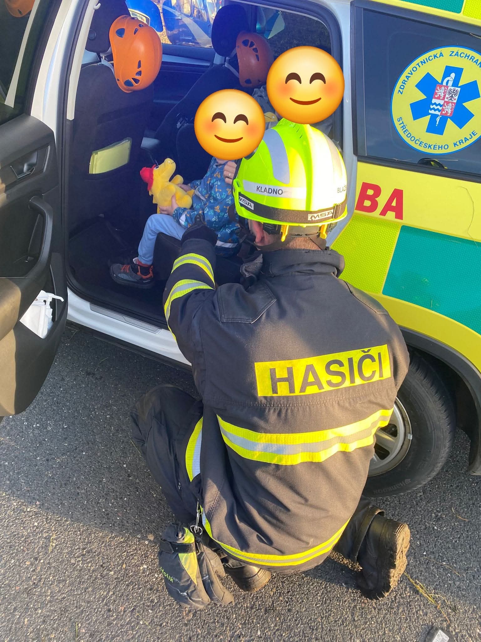 K náročné dopravní nehodě vyjeli profesionální hasiči z Kladna s prvovýjezdovou cisternou, rychlým zásahovým automobilem a velitelským vozem. 2 osobní automobily, motocykl a vlak se střetly u železničního přejezdu. 1 osobu jsme museli vyprostit pomocí hydraulického vyprošťovacího zařízení. Osobu jsme následně transportovali do vrtulníku LZS. 2 dětem jsme poskytly předlékařské ošetření a předali jsme je do péče ZZS. Dalším 2 dětem jsme předali plyšového dráčka. Protože se nehoda nacházela v blízko železničního přejezdu a pohybovali se tam záchranáři, byl omezen provoz na trati snížením rychlosti. Nehodou bylo poškozeno signalizační zařízení přejezdu, proto byla na místo povolána jednotka Správy Železnic Kralupy nad Vltavou a Praha.